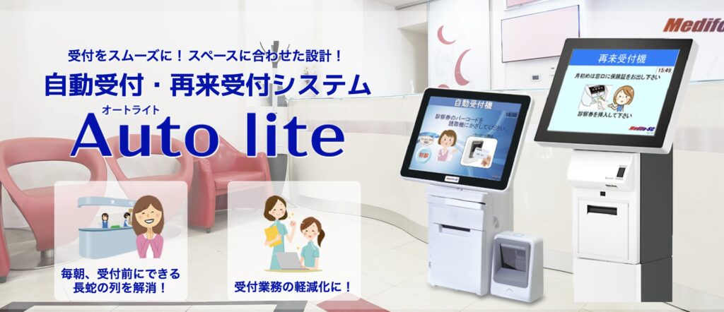 AUTOLITEは、クリニックの受付業務を効率化する無人受付システムで、直感的な操作とスピーディーな受付処理が魅力です。診察券やQRコードをかざすだけで再来受付が可能で、電子カルテやレセコンとの連携によって患者情報が即時に反映され、受付業務の手間を減らします。さらに、問診票の電子入力や、混雑状況の可視化機能など、院内オペレーションを最適化する機能も搭載。