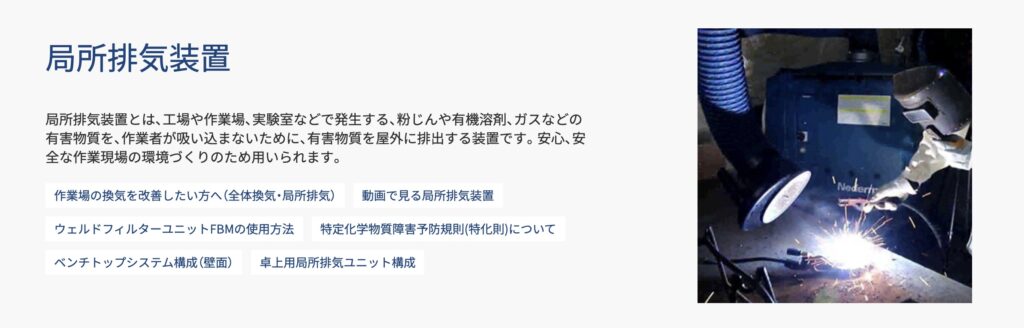 局所排気は単体性能だけでなく、溶剤供給や機器配置、作業者の動線に合わせて「吸い込み位置をどこに置くか」が成果を左右します。同社のように現場機器と合わせた設計の考え方を持つメーカーは、後付けでの改善や運用の工夫まで含めて相談しやすい傾向があります。