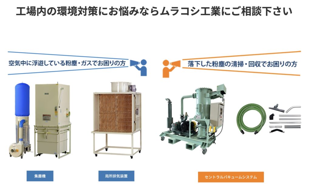 株式会社ムラコシ工業は、集じん・排気に関わる設備提案の領域で知られ、粉じんや切削くず、研磨ダストなど固形物を伴う現場で検討しやすいメーカーです。