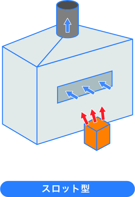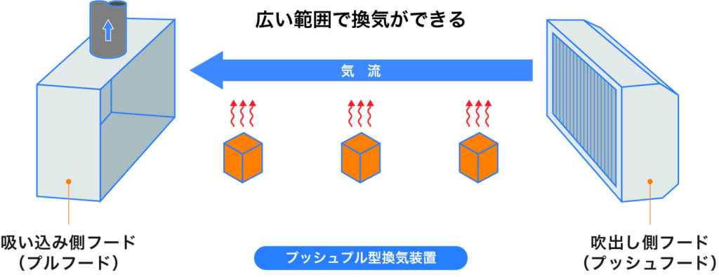 プッシュプル型は、押し出す気流(プッシュ)と吸い込む気流(プル)で、発生源を気流の帯に乗せて回収する方式です。
