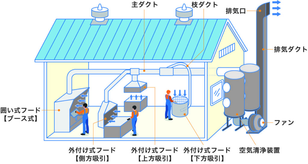 局所排気装置は、塗装ミストや溶剤蒸気が発生する箇所の近くで吸引し、作業者の呼吸域へ広がる前に除去するための設備です。特に発生源が比較的限定される作業では、全体換気より効率よく対策できる場合があります。