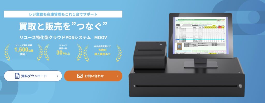 MOOVは、ブランド品や古着などのリユース業に特化したクラウド型POSレジです。査定から買取、販売、在庫管理までを一気通貫で処理できるのが特徴で、タブレット端末から簡単に操作できます。リアルタイムで在庫や売上データを確認でき、複数店舗や倉庫間での在庫移動にも対応。