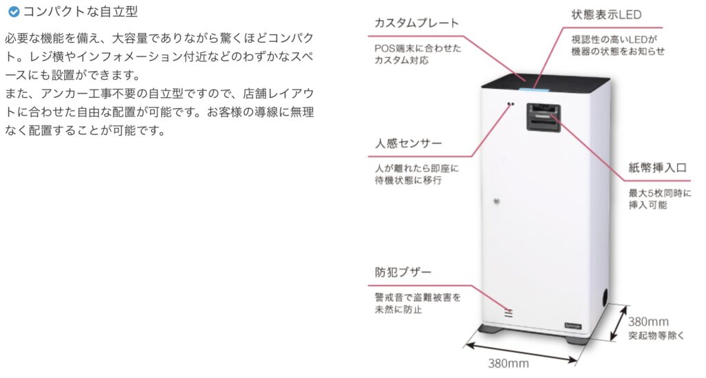 コンパクトな自立型で、現金管理の負担を減らしやすいのも魅力です。スーパー、ドラッグストア、ホームセンターなど、一定の会計件数があり、現金管理を効率化したい小売事業者に向いています。