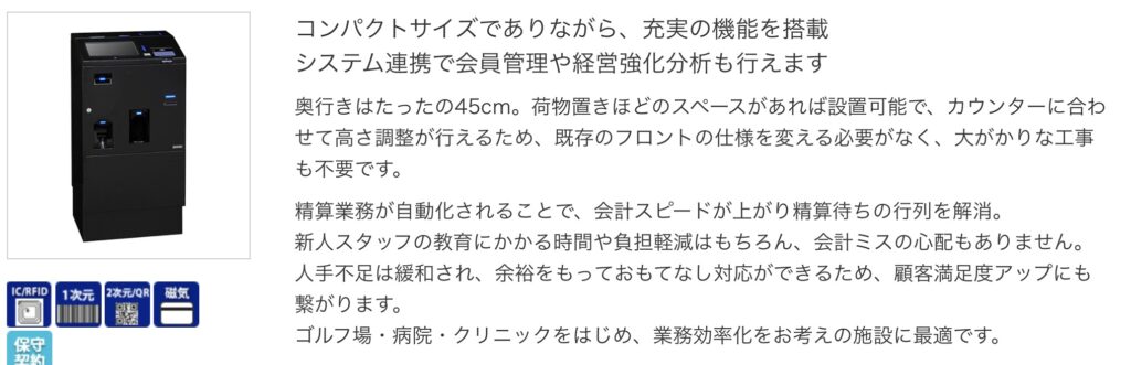患者自身が操作することで会計の正確性を高めつつ、スタッフは案内や他業務に集中しやすくなります。省スペース性を重視したい医療機関に向く一台です。