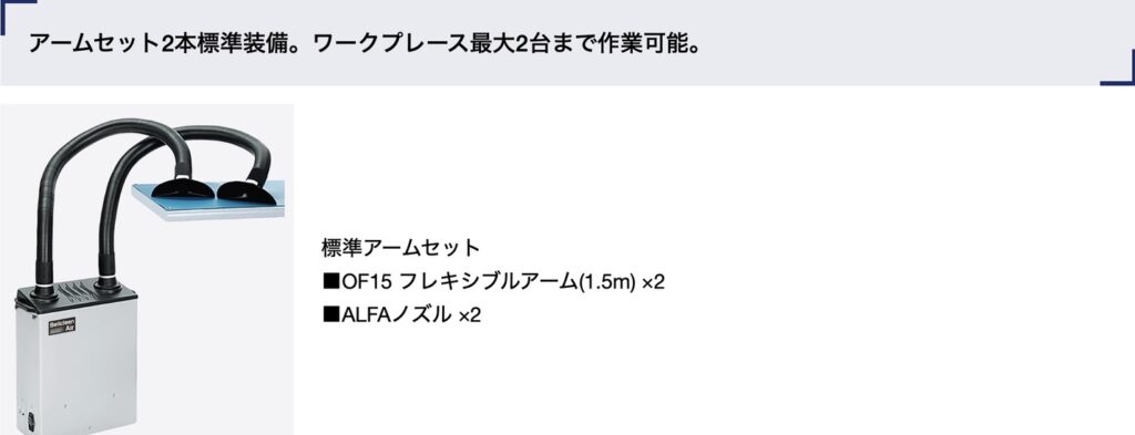 アームの角度や長さを調整できるため、作業性を確保しながら効率よくヒュームを捕集しやすい点が魅力です。ただし、アームの位置が適切でないと十分な効果を発揮できないため、運用ルールの整備や作業者への周知も重要です。実用性と柔軟性のバランスがよいタイプです。